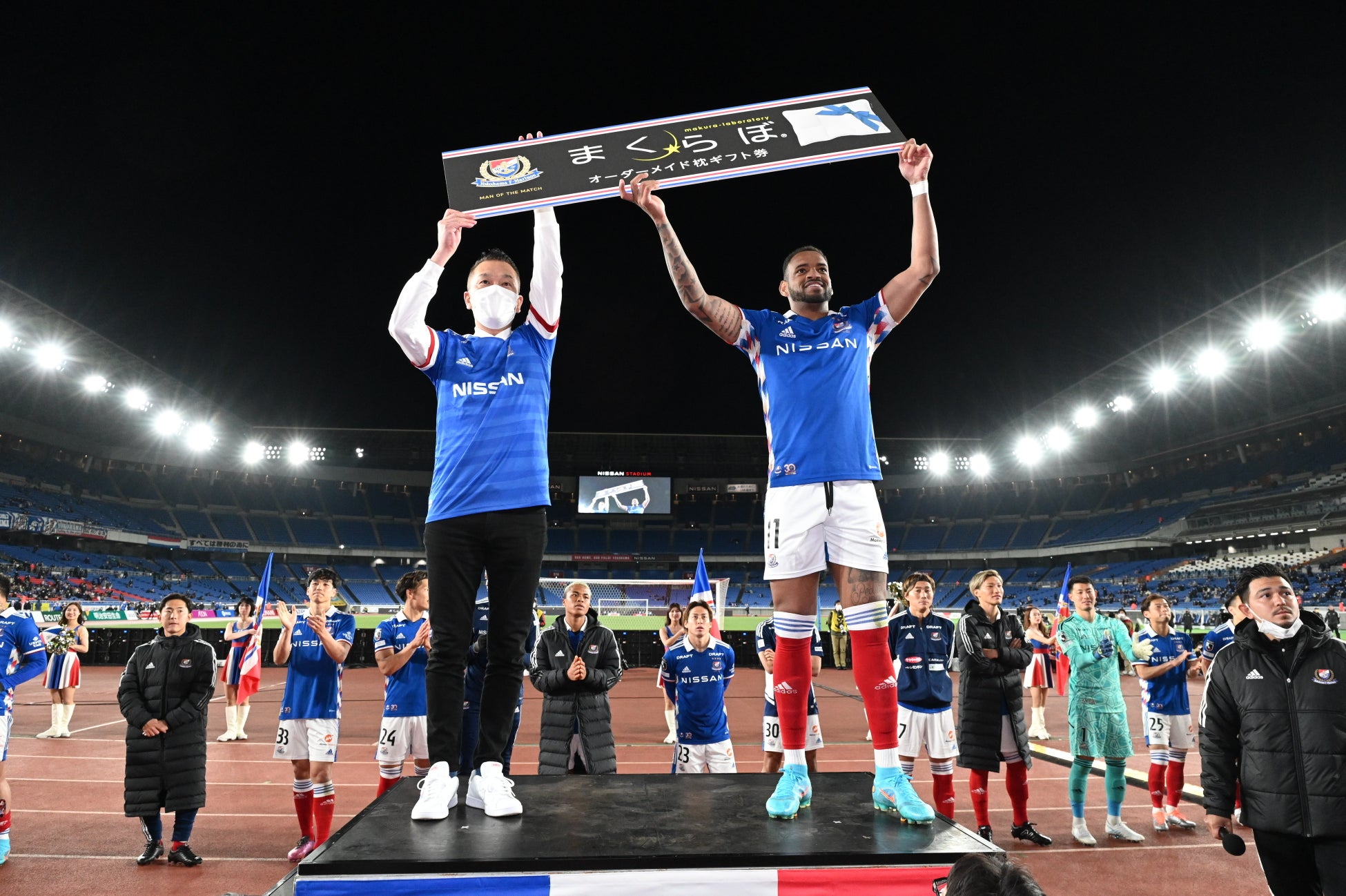 マン・オブ・ザ・マッチに選ばれたのは西村選手、アンデルソン・ロペス選手、水沼選手の3名でした。横浜F・マリノスの公式スポンサーであるまくらぼは、ロペス選手と弊社代表取締役の齊藤が記念撮影を撮る場面もありました。