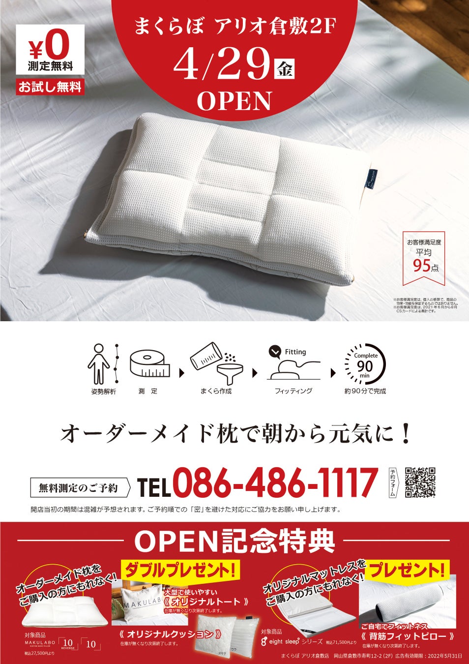 オープン記念として「まくらぼ アリオ倉敷店」にて、当日その場でオーダーメイド枕をご購入の方に