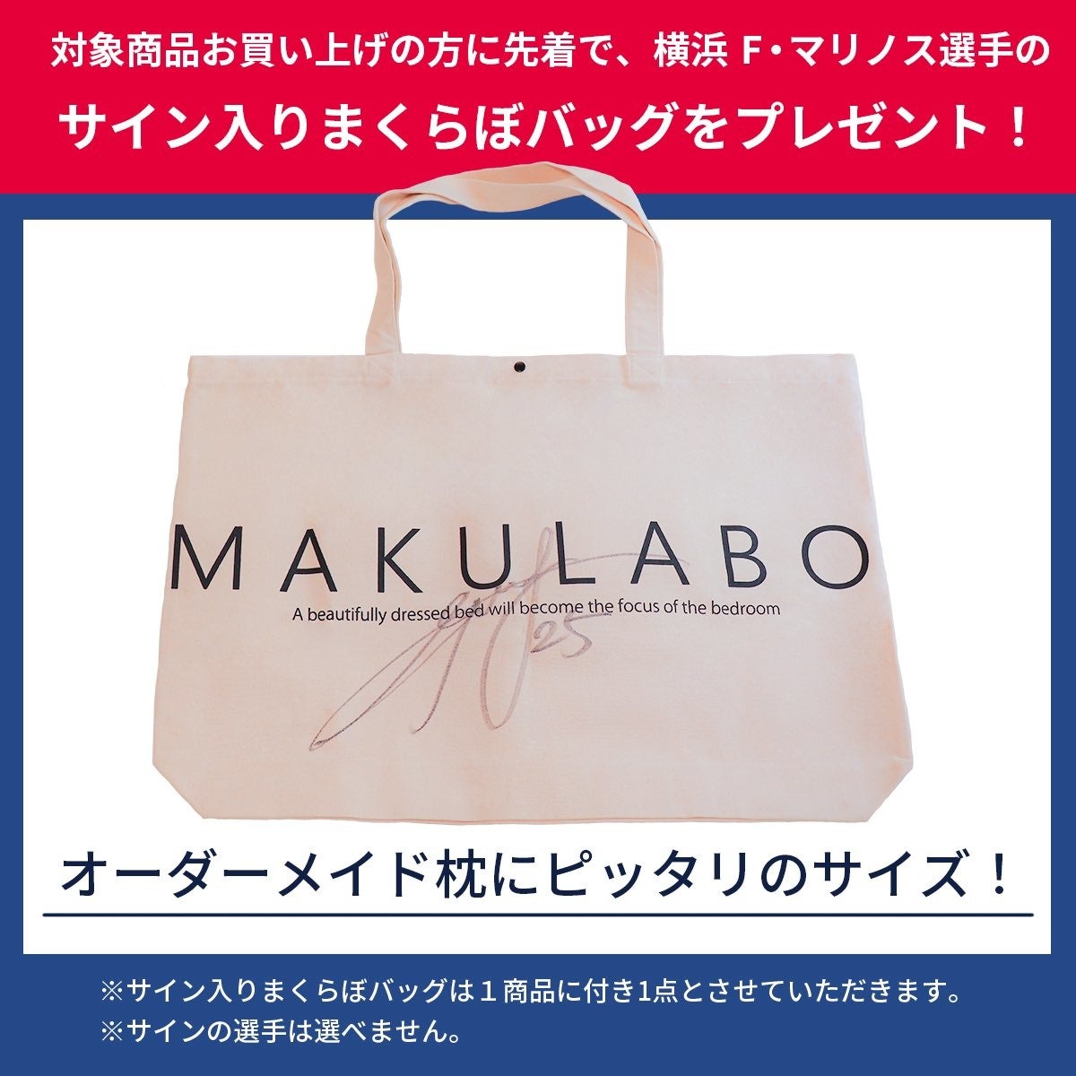 また、まくらぼオンラインショップでは、期間限定で選手のサイン入りバッグ付きの商品も販売中です。
